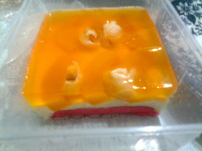 sebenarnye berbeza sedikit dari yg asal.. pasal den salah beli jelly.. hehehee.. nampak tak kaler oren tu .. maka tak nampak laa buat peach yg den susun kat atas tu.. pasal sama kaler ngn jeli.. buah laici nampak gak la skit.... tak banyak buah den isi.. mana yg ada kat dapur cute den tu je..... tak kuasa nak gi membeli mlm2 buta.. kedai pon dah tutup...
